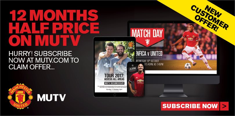 Black Friday offer applies to MUTV.com subscriptions only and is only available from Thursday 23rd November 2017, 16:00 GMT to Friday 24th November 2017, 23:59 GMT. The MUTV Black Friday offer is not available to existing or recently cancelled subscribers. Standard 12 month subscription price varies by market, please visit mutv.manutd.com/terms for full details.